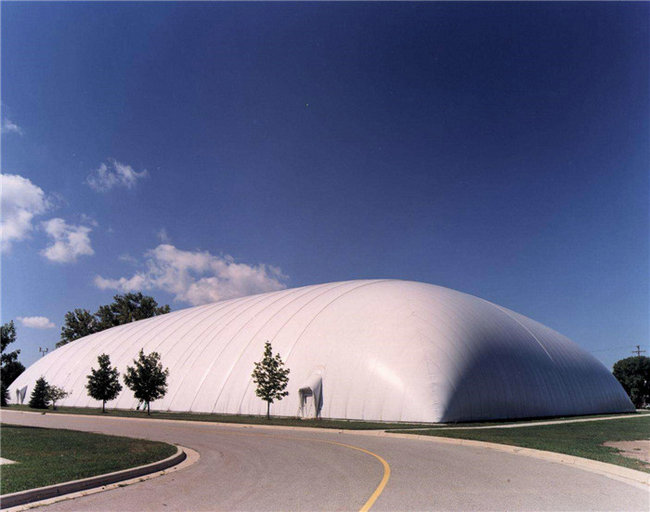 充氣膜結構是指在以高分子材料制成的薄膜制品中充入空氣后而形成房屋的結構。在形式上充氣膜結構與傳統建筑大有不同,又可分為氣承式膜結構和氣脹式膜結構(或叫氣肋式膜結構)。充氣膜結構有單層、雙層、氣肋式三種形式,充氣膜結構一般需要長期不間斷地能源供應。低拱、大跨建筑中的單層充氣膜結構必須是封閉的空間,并保特一定的室內外氣壓差。